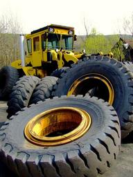 Keywords: tractor wheels rubber tires mining yellow machine old machinery industrial work dirt engine