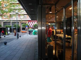 Keywords: trade showcase mannequin street fashion shopping sidewalk space urban highlights metallic glass light natural artificial input windows