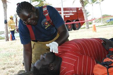 | Keywords: Tradewinds 2014 plane crash exercise 140604-N-IA840-157.jpg en Constable Renee Roberts Antigua and Barbuda Fire Services with Coolidge Fire Station monitors the vital signs of Junior Monford a lifeguard with the Antigua and Barbuda Ministry of Tourism during a mass casualty training exercise here on June 4 Monford and several other lifeguards volunteered as role players simulating injured plane crash survivors during an Antigua and Barbuda Defence Force ABDF training exercise The exercise tested the response capabilities of local emergency services and ABDF members in search and rescue medical triage and treatment tactics and procedures as part of Tradewinds 2014 Tradewinds is a joint combined exercise conducted in conjunction with partner nations to enhance the collective abilities of defense forces and constabularies to counter transnational organized crime and to conduct humanitarian/disaster relief operations U S Navy photo by Chief Mass Communication Specialist Elizabeth Thompson 2014-06-04 Chief Petty Officer Elizabeth Thompson https //www dvidshub net/image/1380641 140604-N-IA840-157 2014-06-05 12 39 ST JOHN'S AG PD-USGov-Military-Navy Tradewinds 2014 Images from DoD uploaded by Fæ |