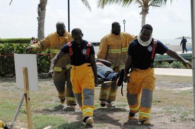 | Keywords: Tradewinds 2014 plane crash exercise 140604-N-IA840-095.jpg en Antigua and Barbuda Fire Services firefighters from St John ™s and Coolidge fire stations transport a plane crash victim from an Antigua and Barbuda Defence Force ABDF Coast Guard boat to an on-site medical post for treatment during a mass casualty training exercise here on June 4 The exercise tested the response capabilities of local emergency services and ABDF servicemembers in search and rescue medical triage and treatment tactics and procedures as part of Tradewinds 2014 Tradewinds is a joint combined exercise conducted in conjunction with partner nations to enhance the collective abilities of defense forces and constabularies to counter transnational organized crime and to conduct humanitarian/disaster relief operations U S Navy photo by Chief Mass Communication Specialist Elizabeth Thompson 2014-06-04 Chief Petty Officer Elizabeth Thompson https //www dvidshub net/image/1380637 140604-N-IA840-095 2014-06-05 12 38 ST JOHN'S AG PD-USGov-Military-Navy Tradewinds 2014 Images from DoD uploaded by Fæ |