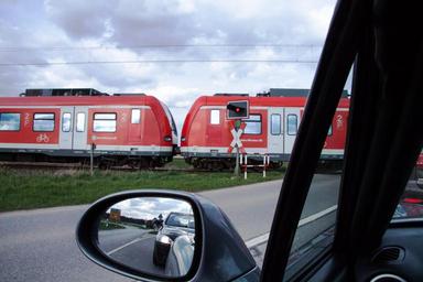 Keywords: traffic transport rear mirror s bahn red train mobile travel connection level crossing wait containing stop