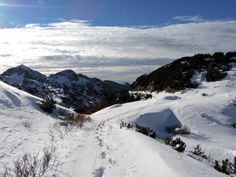Keywords: trail snow footsteps mountain sky clouds alps italy carega