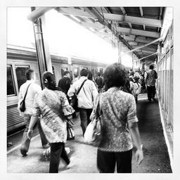 Keywords: train station people movement grunge vintage walking passenger travel late hurry black white