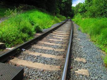 Keywords: train track train railroad railway outdoor nature green sunny ride track