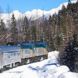 Keywords: train tracks winter snow trees evergreens hills railway transportation