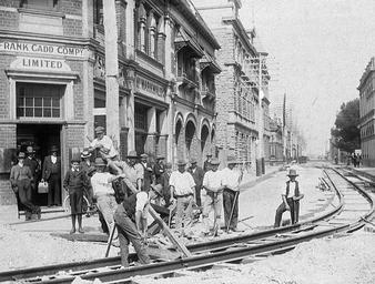 | Keywords: Tramlines Cliff Street Fremantle.jpg en Men working on the laying of tramlines in Cliff Street Fremantle Western Australia On the left is Phillimore Chambers built 1899 to a design by Wilkinson Smith and Wilson and occupied by Frank Cadd Co Next door 6 Cliff Street; and in the centre background the Hotel Fremantle This was erected in 1889 to the design of Wilkinson and Smith On the right side is the Union Bank erected in 1889 and designed by William Edward Robinson of Melbourne The trees in the background on the right side are in the grounds of W F Samson's home City of Fremantle's http //www fremantle wa gov au/Library_and_information/Local_history_collection/Local_history_photographic_collection Local history photographic collection Image Number 618 author 1905 PD-Australia Trams in Fremantle Western Australia Men at work Streets in Western Australia 1905 in Australia Black and white photographs of Australia Black and white photographs of men Black and white photographs of tram transport 1905 in tram transport Tram track construction |
