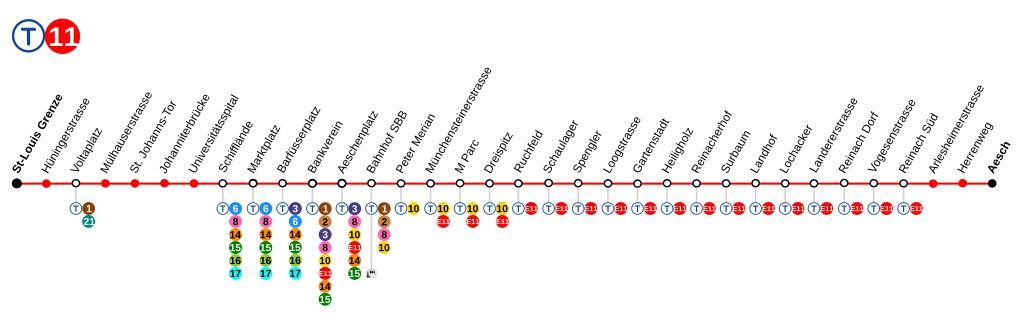 Keywords: Tramway Bâle 11-plan.svg fr Plan de la ligne de tramway numéro 11 du réseau de Bâle own work made with Inkscape from Image Métro Paris M14 2007 svg and Image Plan métro 3 Paris svg Sardon 2009-03-10 Basel tram line 11 Tram maps of Basel