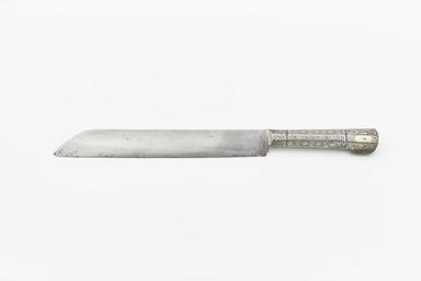 | Keywords: Trancherkniv, förskärare i stål 1640-tal - Skoklosters slott - 102840.tif LSH artwork sv Åttsidigt skaft av brunerat stål ihåligt ornerat med påslaget blekt guld och silver skaftets överdel med kam med konkava sidor utskjutande åt samma sida som bleckets eggsida kammen avslutad nedåt mot bladet med en näbbliknande udd På de två mellansidorna inskription med början på ena sidans överdel HERZ- IACOBVS IN LIFLAND ZV- CVRLAND VND SEMIGALIEN På övriga sidor geometriska bårdmönster av bågränder och närmast bladet sned-och vinkelställda tänder På överdelens båda mittsidor ett långsträckt fält med spetsiga ändar sidorna i övrigt med ytmönster av rankornament <br/>Blad rakt eneggat utan ornering Ryggsidan vid spetsen nedböjd till eggen <br/>Till trancherbestick inv nr 12274-12285 bestående av sex knivar fyra tvåkloiga gafflar och en trekloig gaffel original caption Trancherkniv förskärare i stål 1640-tal <br/> Nyckelord 1640-talet Knivar Föremålsbild Stormaktstiden decade 1640 size mm 331 size mm 30 size mm 215 blad SKO Barockfesten 2015 Skoklosters slott place of origin original filename sm_dig14734 33317 inventory number SKO 12277 102840 CC-BY-SA Erik Lernestål Knives 1640s Sweden 1611-1718 Cutlery Erik Lernestål Media contributed by LSH dim-with multiple size templates Media contributed by LSH 2015-11 |