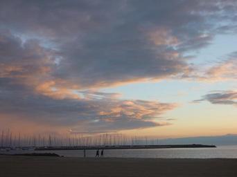 Keywords: tranquil sunset pink mauve blue colorful yachts walking on beach pale sky