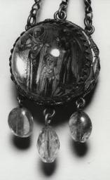| Keywords: Transfiguration - Walters 571975 - Detail.jpg The unusual pendant is made from a copper panel with oil paintings on both sides encased in double cabochon rock-crystal set in a collar of silver filigree enamel One side depicts the Annunciation to the Virgin the other the Presentation of the Virgin in the Temple The miniature paintings are magnified by the crystal century 19 Modern rock crystal skan enamel copper gems cm 3 6 accession number 57 1975 37492 Morton Rosenbaum Philadelphia date of acquisition unknown by purchase Walters Art Museum 1965 by purchase Museum purchase 1965 place of origin Russia Walters Art Museum license Russian art in the Walters Art Museum Decorative and applied arts of Russia Media contributed by the Walters Art Museum needs category review |