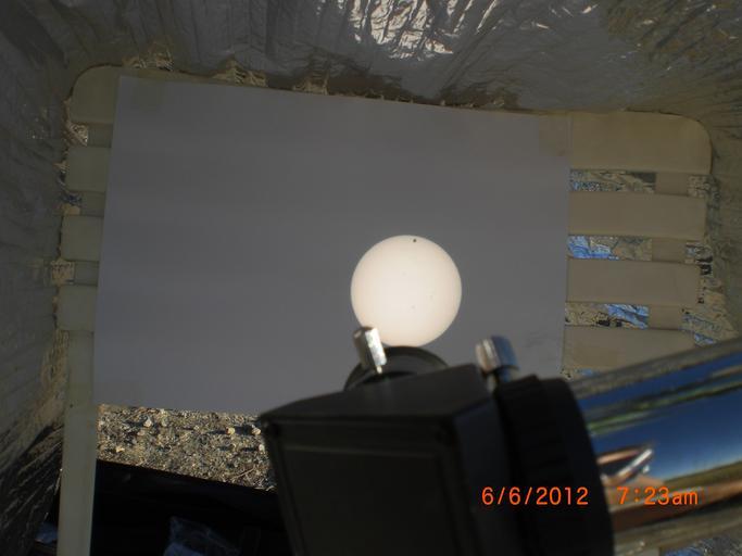 | Keywords: Transit of Venus 2012 (Rhodes).JPG en This is an amateur photo of Venus transit 2012 We can see part of the telescope used and the white paper where the reflection of the Sun plus the shadow of Venus are projected el Ερασιτεχνική φωτογραφία α ό τη διάβαση της Αφροδίτης Παρατηρούμε μέρος του τηλεσκο ίου και τη λευκή σελίδα ου χρησιμο οιήθηκε για την ροβολή του Ήλιου και της σκιάς της Αφροδίτης η φωτογραφία βγήκε στη Ρόδο Ελλάδα Κρυωνάς Βαγγέλης 06 Ιουνίου 2012 36 26 23 12 N 28 12 30 39 E region DE-NI_heading SE Cc-zero Astronomy |