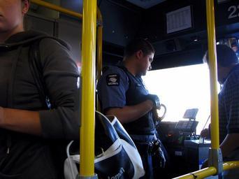 | Keywords: TransLink Insecurity.jpg en Transit security officer aboard a Vancouver bus in order to check fares; bus drivers are often in the habit of allowing a free ride to people who do not pay the fare which management seeks to discourage People who do not have valid fare face a fine of 173 and/or could be removed from the transit system Vancouver BC Canada own Name invalid 2008-07-13 Vancouver BC Canada 2008 in Vancouver Transport workers from Canada | ||||