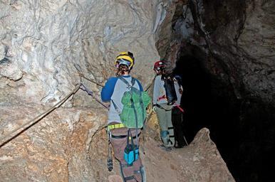Keywords: Cavers safely traverse above a vertical pit. (NPS Photo by Dale Pate) cave cavers