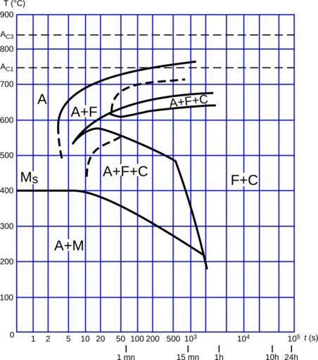 | Keywords: TRC 16MnNiMo5.svg  en Continuous cooling transformation diagram of 16MnNiMo5 steel 16MND5 equivalent to ASTM A508 Cl 3 A austenite; A<sub>C1</sub> temperature of α+perlite †’ α+γ transformation when heating; A<sub>C3</sub> temperature of α+γ †’ γ transformation when heating; C cementite; F ferrite; M martensite; M<sub>s</sub> martensite start fr Diagramme TRC de l'acier 16MnNiMo5 16MND5 équivalent à l'ASTM A508 Cl 3 A austénite ; A<sub>C1</sub> température de transformation α+perlite †’ α+γ au chauffage ; A<sub>C3</sub> température de transformation α+γ †’ γ au chauffage ; C cémentite ; F ferrite ; M martensite ; M<sub>s</sub> début de la martensite martensite start own Cdang 2009-05-29 Created with Inkscape Continuous cooling transformation diagrams |