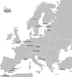 Keywords: TRD destinations map.svg en International destinations from Trondheim Airport Værnes own Alasdair McLellan 2010-02-13 Maps of cities served by flights from given airport Aviation maps of Norway Trondheim Airport Værnes