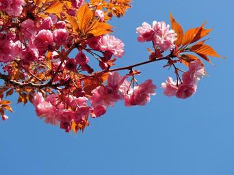 Keywords: tree blooming pink nature spring bloom blossom sky blue sky