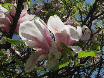 Keywords: tree blossom bloom spring magnolia pink leaves sky blue