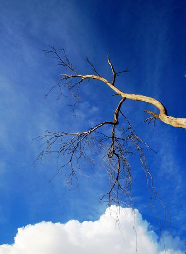 Keywords: tree dry twigs branches cloud white bulky sky very blue wispy smoky cloud