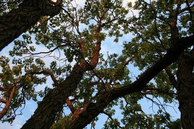Keywords: tree japanese raisin trunks branches weaving strong thick foliage green sunlight sky