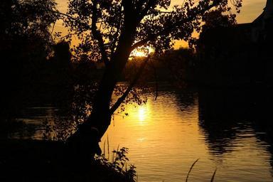 Keywords: tree leaves sunset river danube water road sun evening back light reflection yellow