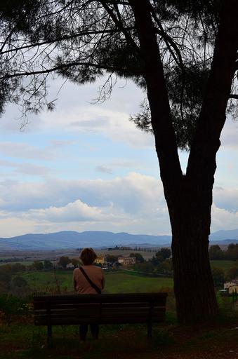 Keywords: tree man bench far away mountains hills italy tuscany clouds sky day summer nature