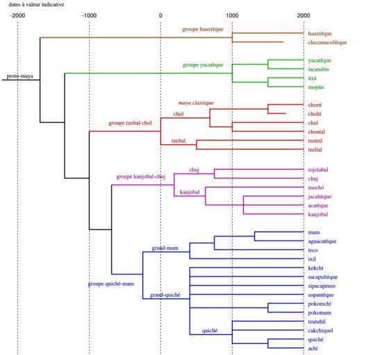 | Keywords: Tree of maya languages.svg Tree of Mayan Languages with glottochronological info dates are purely indicative and main subfamilies Arbre des langues mayas infos glottochronologiques dates à valeur indicative et principales sous-familles Árbol de los idiomas mayas con información glotocronológica las fechas son indicaciones y con las principales subfamilias Maya-Sprachen-Baum mit glottochrologischen Infos Zeitrechnung als unverbindlicher Anhaltspunktst und den meisten Unterfamilien Régis Lachaume 2006-08-21 Self-made see references below Public Domain References used Robert J Sharer La civilisación maya tercera edición Fondo de Cultura 1998 ISBN 968-16-4771-8 fig XIII 2 Contains the basic shape of the tree Raymond G Gordon Jr ed http //www ethnologue com/show_family asp subid 90711 Language family trees Mayan in Ethnologue Languages of the World 15th edition Dallas Tex SIL International Factual corrections update of the language tree model and group names David F Mora-Marín Proto-Ch'olan as the Standard Language of Classic Lowland Mayan Texts Current Anthropology Proto-Ch'olan - then Eastern Ch'olan - Chortí Cholti's ancestor as Classical Maya and update of chortí/chol split date Precautions of use Not all Mayan languages have been reported names in the picture are groups of closely related languages mutually intelligible often with the same name The separations are theoretical reconstructions based on grammar and vocabular differences of today's language as well as phonetic hints from Classical Maya inscriptions IV-Xth centuries Similar language tree A slightly different English version of the Maya Language Tree is available at Image Mayan Language Tree in colour png Indigenous languages of North America Maya Language charts and trees |