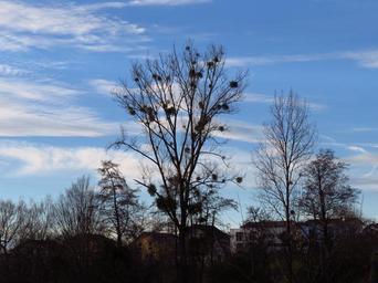Keywords: tree poplar white poplar silhouette black mistletoe viscum sandalwood crop sky blue clear sunny hell warm beautiful clouds federwolke cirrus branches aesthetic crown parasite