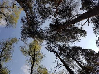 Keywords: trees crown aesthetic spring nature sky blue look up forest