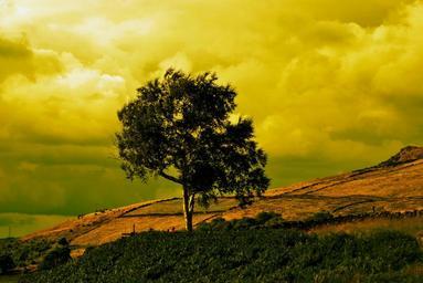 Keywords: trees evenings golden yellow sky lonely isolated perennials plants hills hillside colorful bright sunlight sunsets dusk glowing shiny shining visual effects graphics nature scenic scenery dramatic