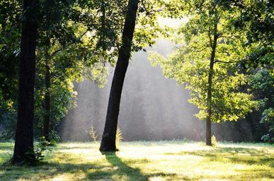 Keywords: trees fog forest sunbeams misty morning woods sun shadow