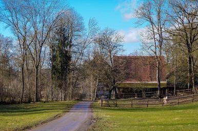 Keywords: trees outdoor horse meadow away sky clouds