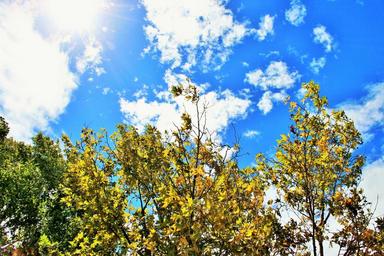 Keywords: trees sky blue clouds white bright leaves autumn