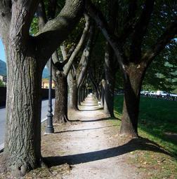 Keywords: trees walkway pathways woods woody trunks parks green leaves grasses bright sunny paths sunlight wooden flora outdoors gardens