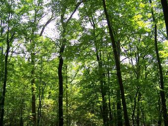 Keywords: trees woods forest green leaves branches summer nature bright sunlight sunny environment outdoors day wild flora greenery