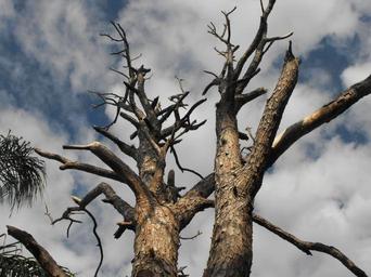 Keywords: trees woods trunks dried wooden branches dry woody stems large big plants flora cloudy sky environment outdoors gardens bright sunny day nature