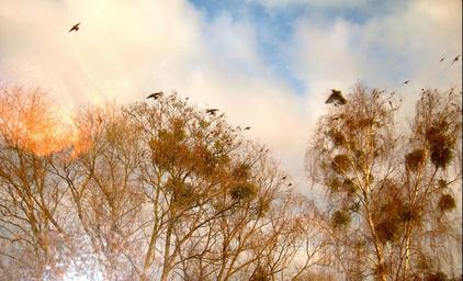Keywords: treetop birds in trees birds in the air abendstimmung evening sun clouds sky blue sky crown