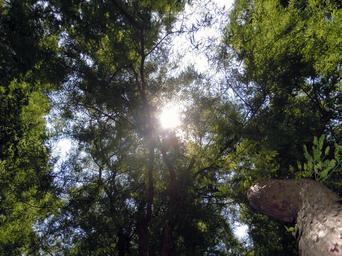 Keywords: treetop trees back light ray of hope sun forest