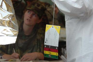 | Keywords: Triage Card DVIDS55619.jpg en A triage card which all of the volunteers playing simulated causalities hold helps the medics sort the casualties by precedence for evacuation during the training exercise on Aug 23 Members of the National Guard from all around the state and civilian volunteers participated in a Chemical Biological Radiological Nuclear and High Yield Explosive CBRNE Enhanced Response Force Package CERF-P training in preparation for certification The Minnesota National Guard is establishing a new emergency response team to provide immediate capabilities to the governor including incident site search capability of damaged buildings rescuing trapped casualties providing decontamination and performing medical triage and initial treatment to stabilize patients for transport to medical facilities 2007-08-23 Staff Sgt Lynette Olivares https //www dvidshub net/image/55619 55619 2007-09-06 16 55 MINNEAPOLIS MN US PD-USGov Minnesota National Guard Images from DoD uploaded by Fæ |