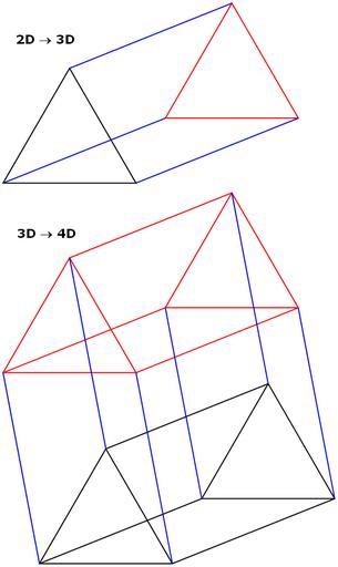 | Keywords: Triangular-prism-3d-4d.png Scheme of formation of triangular parallel prism 2D -> 3D From triangle to 3D triangular prism The resulting solid has 6 vertices 9 edges 5 faces 3D -> 4D From triangualr pyramid to 4D simplex The resulting polytope has 12 vertices 24 edges 19 faces and 7 solids of which 3 rectangular prisms and 4 triangualr prisms Own 2008-10-26 Spiritia Polychora |