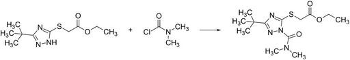 | Keywords: Triazamate synthesis (4).svg validSVG Reaction of ethyl 2- 3- tert-butyl -1H-1 2 4-triazol-5-yl thio acetate and dimethylcarbamic chloride to ethyl 2- 3- tert-butyl -1- dimethylcarbamoyl -1H-1 2 4-triazol-5-yl thio acetate Own 2014-05-02 Emeldir <span class signature-talk >talk</span> PD-chem Insecticide syntheses Condensation reactions |