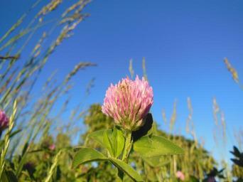 Keywords: trifolium pratense clover flower red clover close-up flowers grass sunshine blue sky on the field plants plant kingdom