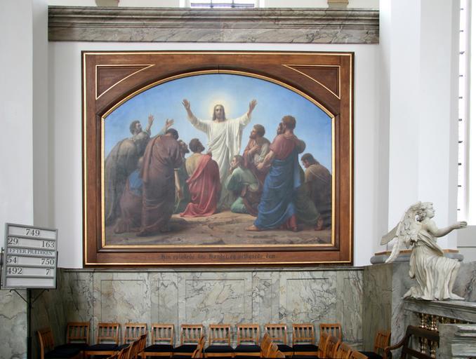 | Keywords: Trinitatis Kirke Copenhagen painting1.jpg Trinitatis Kirke Copenhagen Denmark Velsignelsen en Blessing de Segen The inscription quotes Luke 24 50 Anton Dorph 1873 Own 2006-08-22 Ib Rasmussen Own work all rights released Public domain Trinitatis Kirke - Interior Anton Dorph 1873 paintings Gospel of Luke - Chapter 24 Paintings of the Ascension of Christ |
