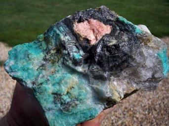 MAKE A MEME View Large Image Manganese Oxides, Amazonite, Quartz, Albite - Morefield Mine, Virginia, USA.jpg Lachsrosafarbener Triplit Nugget mit umliegender Kruste aus Manganoxid auf einer Matrix aus blaugrünem Amazonit Mikroklin-Varietät grauem Quarz und weißem ...
