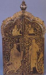 | Keywords: Triptyque of Florennes closed.jpg en triptyque of the abbey of Florennes; Mosan art; gilded silver enamels niello email brun; height 51 cm width opened 57 cm Royal Museums of art and history Brussels Own Goodness Shamrock 1200-1210 Metalwork by Mosan workshops Collection of European decorative arts Jubilee Park Museum Niello Enamel Medieval European enamel |