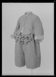| Keywords: Tröja av guldlamé helt täckt av guldbroderi - Livrustkammaren - 70234.tif LSH artwork sv Förmodligen tillverkad i Frankrike Buren av Karl X Gustav 1622-1660 i samband med kröningen <br/>I 1671 års inventarium står En Klädningh som är gjord till H K Maij tz Lÿcklige Cröningh och sägs omfatta följande plagg nämligen kappa tröja byxor knäband skorosor och handskar I 1654 års klädkammarräkning förtecknas dräkten under nr 3 på följande sätt 1 klädning och kappa av filemort gul oskuren sammet helt broderad med guld och med 140 diamantknappar till tröjan och byxorna 1 par strumpeband och skoband av rik guldbrokad helt broderade med guld 1 par underbyxor av incarnadie rosa taft och silkesstrumpor av samma färg 1 guldbroderat med guld och stofferade med guldbrokad 1 panasch plym av couleur de feu röda filemort och aurorafärgade fjädrar 1 par förgyllda sporrar och 1 värja med förgyllt fäste <br/>Nu finns endast tröjan och byxorna i behåll i sitt skick som dräkt medan den stora rundskurna kappan inte längre omtalas i inventarierna efter 1691 1704 års inv säger inget om kappan men den finns förvandlad till mässhake och altarbrun i Riddarsholmskyrkan Skänkta dit den 1 april 1705 av Riksänkedrottningen Hedvig Eleonora Mässhaken Gjord av tjock gul rips OBS Fel Enl Sveriges kyrkor skall vara sammet oskuren ett material som skiljer sig från såväl tröjans som byxornas Broderad med mönster i guld på samma sätt som på tröjan och byxorna Mönsterrapport 8 x 8 cm Såväl fram- som bakstycket består av 2 hopsydda våder av c a 40 cm bredd max längd ca 90 cm Drottningens namnchiffer HRS samt ANNO 1705 har broderats på respektive fram- och baksidorna <br/>Tröjan är sydd av vad man med ett modernt namn skulle beteckna som guldlamé som helt täckts med guldbroderi Den är av s k innocenttyp d v s ett relativt kort livplagg med planschetter inlagda som styvnad i framstyckenas snibbiga främre hörn försett med 10 små skört ståndkrage och relativt korta ärmar med öppna sömmar framtill På vänster framstycke har 17 st 2 cm knapphål sytts med jämna mellanrum ca 1 cm från kanten Vad man bör lägga märke till är att tröjan sytts av ett större antal stycken som skarvats samman Förmodligen har plagget antingen redan varit i tidigare bruk före kröningen 1654 och blivit något förtrångt eller också har man misslyckats med passformen vid tillfället i fråga och har varit tvungen att göra en del ändringar Möjligheten att tröjan kan ha förändrats vid något senare tillfälle kan man inte heller bortse ifrån <br/>Bottenmaterialet består nämligen av två skilda lamétyger ett något gulare i de smalare skarvarna och f ö ett något rödare det egentliga materialet Tröjan är huvudsakligen skuren i 2 framstycken 2 ryggstycken samt 2 ärmstycken till vardera ärmen 10 skört samt krage Man kan alltså visa att framstyckena måste skarvas med remsor av det gulare tyget utefter de raka framkanterna samt även i sidsömmen I halsringningen har en liten kil satts in mellan det vertikala skarvstycket fram och axelsömmen Bakstyckena ha fått var sin vertikala skarv knappt 4 cm bred mitt i ryggen på ömse sidor om mittsömmen Utefter ärmarnas öppna långsidor har vertikala stycken fogats till och nere vid ärmens avslutning har på undersidans stycken en smal horisontell remsa sytts På överärmstycket däremot har en horisontell skarv satts in överst uppe vid ärmringningen Kragen är också uppklippt baktill och försedd med 2 små skarvstycken Det 3 e skörtet på varje sida är eventuellt nysytt ty dess färg förefaller ljusare broderiet är klumpigare och kompositionen annorlunda mot alla de övriga 8 som exempelvis har den lilla blomman nedtill i mitten <br/>Mönstret har i någon mån missuppfattats i de senare sydda styckena så har man t ex lagt krepiner och trådar i båge i stället för att klippa av dem och börja med en ny tråd Ärmarnas nedersta parti mellan 3 5-7 cm är lämnat utan broderi beroende på att det ju skulle vikas till uppslag Ärmarna har inga knappar eller knapphål intill sprunden vid handlederna I midjan sitter på insidan under skörten 8 st små tampar med vardera 2 hål för byxornas hakar Guldlamén har en vådbredd av minst 31 cm utan stad 45x15 tr/cm2 Varje inslag består av gult silke med 2 och 2 smala trinda guldtenar på rätan <br/>Analysresultat <br/>Metalltråd tvinnad med textiltråd huvudbeståndsdelar <br/>Silver xxx<br/>Guld x<br/>Koppar xxx<br/>Zink 0<br/>Det yttäckande läggsömsbroderiet består av kantiljer av trinda tenar och platta lan av olika bredd snodder med silkeskärna omtvinnade med guldlan strängar dragna av trinda tenar av guld eller silver som stansats ut i spiraler eller öglor och manglats platta på halva sidan här benämnda spiral- eller paljett strängar i brist på befintlig terminologi och 2 och 2 tätt liggande strängar med trinda smala guldtenar virade runt ett bredare guldanklätt snöre etc Broderiet är nersytt med gult silke Mönsterraporten är 6 5x6 5 cm Mönstret Ur 2 från varandra utåtböjda palmkvistar som strax nedanför mitten sammanhålles med en uppåtböjd båge växa omväxlande 5- och 8-flikiga icke naturalistiska blommor upp <br/>Analysresultat <br/>Metalltrådsbroderi huvudbeståndsdelar <br/>Silver xxx<br/>Guld xxx<br/>Koppar xxx<br/>Zink 0<br/>Tröjan är garnerad med en 2 3 cm bred knypplad uddspets av guldtråd med 2 inlagda guldlan Mönsterrapporten är c a 2 5 cm Spetsen sitter på bägge främre ytterkanterna knapparna har alltså suttit ovanpå spetsen och fortsätter därifrån omedelbart runt de 2 främre skörten Vidare sitter det spets runt de 3 ytterkanterna av varje skört på axel-och sidsömmarna runt ärmhålen och längs de öppna ärmsömmarna sprunden Den ursprungliga knäppningen finns inte längre kvar diamantknapparna lät änkedrottningen ta ur och använda för annat ändamål Numera knäppes tröjan med h