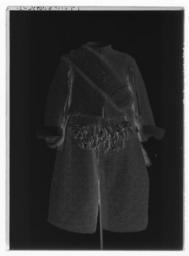 | Keywords: Tröja av guldlamé helt täckt av guldbroderi - Livrustkammaren - 61568-negative.tif LSH artwork sv Förmodligen tillverkad i Frankrike Buren av Karl X Gustav 1622-1660 i samband med kröningen Dräkten beställdes 1654 från Frankrike genom Magnus Gabriel de la Gardie inför festligheterna vid Karl X Gustavs kröning och efterförljande bröllop Sex dräkter levererades och den här beskrivna var den högst värderade Ursprungligen var den försedd med 140 diamantknappar vilka änkedrottningen Hedvig Eleonora tog hand om efter kungens död Hon lät också sprätta bort merparten av guldspetsarna för att använda dem till utrustningen för kritzryttaren i makens sorgetåg Till dräktens kompletta utrustning hörde 1654 sko- och strumpeband av gllenduk högröda taftunderbyxor och silkesstrumpor ett guldbroderat gehäng hattband av guld handskar med gllenduksfodrade kragar en panasch med fjädrar i förgerna coleur de feu filemort och aurora samt ett par förgyllda sporrar och en värja med dito fäste I 1671 års inventarium står En Klädningh som är gjord till H K Maij tz Lÿcklige Cröningh och sägs omfatta följande plagg nämligen kappa tröja byxor knäband skorosor och handskar I 1654 års klädkammarräkning förtecknas dräkten under nr 3 på följande sätt 1 klädning och kappa av filemort gul oskuren sammet helt broderad med guld och med 140 diamantknappar till tröjan och byxorna 1 par strumpeband och skoband av rik guldbrokad helt broderade med guld 1 par underbyxor av incarnadie rosa taft och silkesstrumpor av samma färg 1 guldbroderat med guld och stofferade med guldbrokad 1 panasch plym av couleur de feu röda filemort och aurorafärgade fjädrar 1 par förgyllda sporrar och 1 värja med förgyllt fäste Nu finns endast tröjan och byxorna i behåll i sitt skick som dräkt medan den stora rundskurna kappan inte längre omtalas i inventarierna efter 1691 1704 års inv säger inget om kappan men den finns förvandlad till mässhake och altarbrun i Riddarsholmskyrkan Skänkta dit den 1 april 1705 av Riksänkedrottningen Hedvig Eleonora Mässhaken Gjord av tjock gul rips OBS Fel Enl Sveriges kyrkor skall vara sammet oskuren ett material som skiljer sig från såväl tröjans som byxornas Broderad med mönster i guld på samma sätt som på tröjan och byxorna Mönsterrapport 8 x 8 cm Såväl fram- som bakstycket består av 2 hopsydda våder av c a 40 cm bredd max längd ca 90 cm Drottningens namnchiffer HRS samt ANNO 1705 har broderats på respektive fram- och baksidorna Tröjan är sydd av vad man med ett modernt namn skulle beteckna som guldlamé som helt täckts med guldbroderi Den är av s k innocenttyp d v s ett relativt kort livplagg med planschetter inlagda som styvnad i framstyckenas snibbiga främre hörn försett med 10 små skört ståndkrage och relativt korta ärmar med öppna sömmar framtill På vänster framstycke har 17 st 2 cm knapphål sytts med jämna mellanrum ca 1 cm från kanten Vad man bör lägga märke till är att tröjan sytts av ett större antal stycken som skarvats samman Förmodligen har plagget antingen redan varit i tidigare bruk före kröningen 1654 och blivit något förtrångt eller också har man misslyckats med passformen vid tillfället i fråga och har varit tvungen att göra en del ändringar Möjligheten att tröjan kan ha förändrats vid något senare tillfälle kan man inte heller bortse ifrån Bottenmaterialet består nämligen av två skilda lamétyger ett något gulare i de smalare skarvarna och f ö ett något rödare det egentliga materialet Tröjan är huvudsakligen skuren i 2 framstycken 2 ryggstycken samt 2 ärmstycken till vardera ärmen 10 skört samt krage Man kan alltså visa att framstyckena måste skarvas med remsor av det gulare tyget utefter de raka framkanterna samt även i sidsömmen I halsringningen har en liten kil satts in mellan det vertikala skarvstycket fram och axelsömmen Bakstyckena ha fått var sin vertikala skarv knappt 4 cm bred mitt i ryggen på ömse sidor om mittsömmen Utefter ärmarnas öppna långsidor har vertikala stycken fogats till och nere vid ärmens avslutning har på undersidans stycken en smal horisontell remsa sytts På överärmstycket däremot har en horisontell skarv satts in överst uppe vid ärmringningen Kragen är också uppklippt baktill och försedd med 2 små skarvstycken Det 3 e skörtet på varje sida är eventuellt nysytt ty dess färg förefaller ljusare broderiet är klumpigare och kompositionen annorlunda mot alla de övriga 8 som exempelvis har den lilla blomman nedtill i mitten Mönstret har i någon mån missuppfattats i de senare sydda styckena så har man t ex lagt krepiner och trådar i båge i stället för att klippa av dem och börja med en ny tråd Ärmarnas nedersta parti mellan 3 5-7 cm är lämnat utan broderi beroende på att det ju skulle vikas till uppslag Ärmarna har inga knappar eller knapphål intill sprunden vid handlederna I midjan sitter på insidan under skörten 8 st små tampar med vardera 2 hål för byxornas hakar Guldlamén har en vådbredd av minst 31 cm utan stad 45x15 tr/cm2 Varje inslag består av gult silke med 2 och 2 smala trinda guldtenar på rätan Analysresultat Metalltråd tvinnad med textiltråd huvudbeståndsdelar Silver xxxGuld xKoppar xxxZink 0Det yttäckande läggsömsbroderiet består av kantiljer av trinda tenar och platta lan av olika bredd snodder med silkeskärna omtvinnade med guldlan strängar dragna av trinda tenar av guld eller silver som stansats ut i spiraler eller öglor och manglats platta på halva sidan här benämnda spiral- eller paljett strängar i brist på befintlig terminologi och 2 och 2 tätt liggande strängar med trinda smala guldtenar virade runt ett bredare guldanklätt snöre etc Broderiet är nersytt med gult silke Mönsterraporten är 6 5x6 5 cm Mönstret Ur 2 från varandra utåtböjda palmkvistar som strax nedanför mitten sammanhålles med en uppåtböjd båge växa omväxla