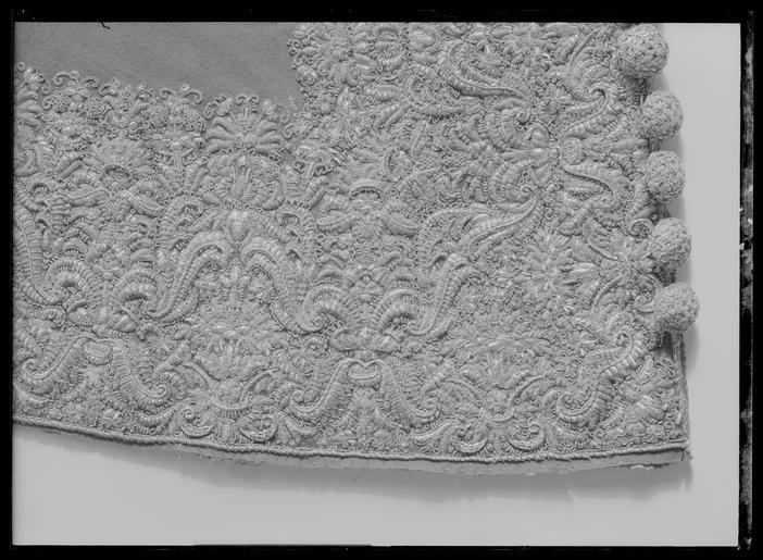 Keywords: Tröja av mönstrad silverbrokad, ca 1650-1660 - Livrustkammaren - 61640.tif LSH artwork sv Buren av Karl X Gustav 1622-1660 vid kröningen 1654-06-06 okänd tillverkare <br/>Tröja Livplagg av innocenttyp Skuren i 2 lika stora framstycken vars framkanter följer staden 1 helt bakstycke 1 ståndkrage 10 små skört samt 2 svängda stycken för varje ärm Plagget är sytt av rik silverbrokad och har även foder av silverbrokad i annat mönster Tröjan är försedd med mellanfoder av linnelärft 20x19 tr/cm2 och planschetter triangelformade styvnader nedtill i de spetsiga framkanterna Kragen är på insidan fodrad med vitt mönstrat siden av samma sort som återkommer i tröjan till dräkt nr 3401 och har mellanfoder av linnelärft 25x21 tr/cm2 med inlagd styvnad troligen fiskben Vänsterframstycke har 21 knapphål för de bevarade 21 knapparna i höger framstycke Knapphålen är sydda med vitt högertvinnat silke 8 stygn/cm över 1 tråd Knapparna d 1 3 cm är med silverlansomspunnet vitt högertvinnat silke trind kantilj och silverlan Tre stycken likadana knappar sitter i kragen men motsvarande tränsar saknas <br/>Silverbrokaden som utgör tröjans övertyg benämnes rik silverduk Den kan beskrivas på följande sätt Vådbredd minst 50 cm 72x18 tr/cm2 Varp av tunt vitt otvinnat silke De grövre otvinnade vita inslagstrådarna bildar dels botten med silverlan i varje inslag dels blommönster av flotterade trådar med högertvinnade silverlan i varje sådant inslag Stad 1 cm 10 gröna 4 orange 12 gröna 1 vit tråd Mönsterrapport 8 8 x 8 8 cm Mönstret är symmetriskt uppbyggt med halvnaturalistiska blommor sammanhållna i rosettlika arrangemang Ärmarna är avsedda att ha den främre sömmen öppen På de motsatta bakre sömmarna har ärmarna sprund nedtill vid handleden Man har avsett att vika upp ärmensnederkant till uppslag Förutom de 10 trapetsformade skörten sitta i midjan på tröjansinsida 7 st stroppar klädda med foderbrokaden vardera med 2 hål för de 7 silverhakarna ibyxlinningen 4 sitter på den vänstra sidan och 3 på den högra Silverbrokaden som utgörtröjans foder benämnes också i de äldre inventarierna silverduk <br/>Denna har en vådbredd av minst 51 cm c a 70 x 18 á 19 tr/cm2 Mycket tunn och tät varp avvita otvinnade silkestrådar där dessa bildar botteninslag ha de försetts med silverlan pårätan De flotterande mönstertrådarna är däremot endast av vitt silke Ripsvävnad Stad 0 8 cm 12 gröna 4 gulorange 10 gröna 1 tjockare vit tråd - vävnad i tuskaft Mönsterrapport h 7 7 cm b 6 6 cm Det är ett halvnaturalistiskt blomstermönster med enkarakteristisk figur som erinrar om en fjäder Samma silverbrokad återkommer som foder itröjan nr 3389 All garnering och dekor av spetsar har sprättats bort och tröjans foder harskadats upptill Kragen har även brännskada vilket tyder på att den lämnats till utbrännning På kragens insida har man med bläck märkt plagget N 43 en åtgärd somstammar från 1789 original caption Karl X Gustavs kröning < 1654 brocade d1 - dräkt - yttermaterial material silverbrokad - linen - silk Färg vit material siden - silk Färg vit material silke - silver - silver - brocade d1 - dräkt - yttermaterial material silverbrokad LRK Karl X Gustav av Sverige Gallica 1945 Sweden - A Royal Treasury 1988-1989 Slottet brinner 1997 1648 Westfaliska freden 1998 Modelejon 2002 Les arts décoratifs sous Louis XIII 2002 Sweden and Europe 1632-1792 2003-2004 Silver - Makt o prakt i barockens Sverige 2003-2004 place of origin original filename LN_B14287_017167 67897 inventory number LRK 31304 61640 CC0 Tröja av mönstrad silverbrokad ca 1650-1660 - Livrustkammaren - 61640-negative tif <gallery caption Different images of same object > File Tröja av mönstrad silverbrokad ca 1650-1660 - Livrustkammaren - 18866 tif File Tröja av mönstrad silverbrokad ca 1650-1660 - Livrustkammaren - 10303 tif File Dräkt i rött och silvertyg som tillhört Karl X Gustav - Livrustkammaren - 65159 tif File Tröja av mönstrad silverbrokad ca 1650-1660 - Livrustkammaren - 70230 tif File Tröja av mönstrad silverbrokad ca 1650-1660 - Livrustkammaren - 78761 tif File Tröja av mönstrad silverbrokad ca 1650-1660 - Livrustkammaren - 53091 tif File Tröja av mönstrad silverbrokad ca 1650-1660 - Livrustkammaren - 35972 tif File Tröja av mönstrad silverbrokad ca 1650-1660 - Livrustkammaren - 78789 tif File Dräkt i rött och silvertyg som tillhört Karl X Gustav - Livrustkammaren - 73721 tif File Tröja av mönstrad silverbrokad ca 1650-1660 - Livrustkammaren - 70202 tif File Tröja av mönstrad silverbrokad ca 1650-1660 - Livrustkammaren - 10304 tif File Dräkt i rött och silvertyg som tillhört Karl X Gustav - Livrustkammaren - 56598 tif File Tröja av mönstrad silverbrokad ca 1650-1660 - Livrustkammaren - 1744 tif File Tröja av mönstrad silverbrokad ca 1650-1660 - Livrustkammaren - 44530 tif </gallery> Coronation of Charles X of Sweden Shirts Media contributed by LSH 2014-11 |