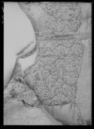 Keywords: Tröja av mönstrad silverbrokad, ca 1650-1660 - Livrustkammaren - 53091.tif LSH artwork sv Buren av Karl X Gustav 1622-1660 vid kröningen 1654-06-06 okänd tillverkare <br/>Tröja Livplagg av innocenttyp Skuren i 2 lika stora framstycken vars framkanter följer staden 1 helt bakstycke 1 ståndkrage 10 små skört samt 2 svängda stycken för varje ärm Plagget är sytt av rik silverbrokad och har även foder av silverbrokad i annat mönster Tröjan är försedd med mellanfoder av linnelärft 20x19 tr/cm2 och planschetter triangelformade styvnader nedtill i de spetsiga framkanterna Kragen är på insidan fodrad med vitt mönstrat siden av samma sort som återkommer i tröjan till dräkt nr 3401 och har mellanfoder av linnelärft 25x21 tr/cm2 med inlagd styvnad troligen fiskben Vänsterframstycke har 21 knapphål för de bevarade 21 knapparna i höger framstycke Knapphålen är sydda med vitt högertvinnat silke 8 stygn/cm över 1 tråd Knapparna d 1 3 cm är med silverlansomspunnet vitt högertvinnat silke trind kantilj och silverlan Tre stycken likadana knappar sitter i kragen men motsvarande tränsar saknas <br/>Silverbrokaden som utgör tröjans övertyg benämnes rik silverduk Den kan beskrivas på följande sätt Vådbredd minst 50 cm 72x18 tr/cm2 Varp av tunt vitt otvinnat silke De grövre otvinnade vita inslagstrådarna bildar dels botten med silverlan i varje inslag dels blommönster av flotterade trådar med högertvinnade silverlan i varje sådant inslag Stad 1 cm 10 gröna 4 orange 12 gröna 1 vit tråd Mönsterrapport 8 8 x 8 8 cm Mönstret är symmetriskt uppbyggt med halvnaturalistiska blommor sammanhållna i rosettlika arrangemang Ärmarna är avsedda att ha den främre sömmen öppen På de motsatta bakre sömmarna har ärmarna sprund nedtill vid handleden Man har avsett att vika upp ärmensnederkant till uppslag Förutom de 10 trapetsformade skörten sitta i midjan på tröjansinsida 7 st stroppar klädda med foderbrokaden vardera med 2 hål för de 7 silverhakarna ibyxlinningen 4 sitter på den vänstra sidan och 3 på den högra Silverbrokaden som utgörtröjans foder benämnes också i de äldre inventarierna silverduk <br/>Denna har en vådbredd av minst 51 cm c a 70 x 18 á 19 tr/cm2 Mycket tunn och tät varp avvita otvinnade silkestrådar där dessa bildar botteninslag ha de försetts med silverlan pårätan De flotterande mönstertrådarna är däremot endast av vitt silke Ripsvävnad Stad 0 8 cm 12 gröna 4 gulorange 10 gröna 1 tjockare vit tråd - vävnad i tuskaft Mönsterrapport h 7 7 cm b 6 6 cm Det är ett halvnaturalistiskt blomstermönster med enkarakteristisk figur som erinrar om en fjäder Samma silverbrokad återkommer som foder itröjan nr 3389 All garnering och dekor av spetsar har sprättats bort och tröjans foder harskadats upptill Kragen har även brännskada vilket tyder på att den lämnats till utbrännning På kragens insida har man med bläck märkt plagget N 43 en åtgärd somstammar från 1789 original caption Karl X Gustavs kröning < 1654 brocade d1 - dräkt - yttermaterial material silverbrokad - linen - silk Färg vit material siden - silk Färg vit material silke - silver - silver - brocade d1 - dräkt - yttermaterial material silverbrokad LRK Karl X Gustav av Sverige Gallica 1945 Sweden - A Royal Treasury 1988-1989 Slottet brinner 1997 1648 Westfaliska freden 1998 Modelejon 2002 Les arts décoratifs sous Louis XIII 2002 Sweden and Europe 1632-1792 2003-2004 Silver - Makt o prakt i barockens Sverige 2003-2004 place of origin original filename LN_B14406_017286 67897 inventory number LRK 31304 53091 CC0 Tröja av mönstrad silverbrokad ca 1650-1660 - Livrustkammaren - 53091-negative tif <gallery caption Different images of same object > File Tröja av mönstrad silverbrokad ca 1650-1660 - Livrustkammaren - 18866 tif File Tröja av mönstrad silverbrokad ca 1650-1660 - Livrustkammaren - 10303 tif File Dräkt i rött och silvertyg som tillhört Karl X Gustav - Livrustkammaren - 65159 tif File Tröja av mönstrad silverbrokad ca 1650-1660 - Livrustkammaren - 70230 tif File Tröja av mönstrad silverbrokad ca 1650-1660 - Livrustkammaren - 78761 tif File Tröja av mönstrad silverbrokad ca 1650-1660 - Livrustkammaren - 61640 tif File Tröja av mönstrad silverbrokad ca 1650-1660 - Livrustkammaren - 35972 tif File Tröja av mönstrad silverbrokad ca 1650-1660 - Livrustkammaren - 78789 tif File Dräkt i rött och silvertyg som tillhört Karl X Gustav - Livrustkammaren - 73721 tif File Tröja av mönstrad silverbrokad ca 1650-1660 - Livrustkammaren - 70202 tif File Tröja av mönstrad silverbrokad ca 1650-1660 - Livrustkammaren - 10304 tif File Dräkt i rött och silvertyg som tillhört Karl X Gustav - Livrustkammaren - 56598 tif File Tröja av mönstrad silverbrokad ca 1650-1660 - Livrustkammaren - 1744 tif File Tröja av mönstrad silverbrokad ca 1650-1660 - Livrustkammaren - 44530 tif </gallery> Coronation of Charles X of Sweden Shirts Media contributed by LSH 2014-11 |