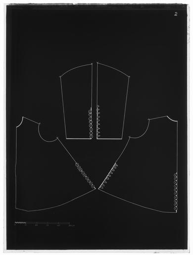 Keywords: Tröja av sämskskinn. Förmodligen tillverkad av Jehan Beranger, Stockholm - Livrustkammaren - 34481-negative.tif LSH artwork Friderich Feuerbrun pärlstickare Jehan Johan Beranger brodör sv Tröjan av sämskat skinn som tydligen parfymerats av s k innocenttyp med svängd midjelinje 10 skört ståndkrage och relativt korta ärmar med öppna sömmar framtill På grund av det ganska stela och styva materialet eller av att man begagnat sig av ett något urvuxet plagg har man försett det med diverse kilar och tillskarvade stycken Tydligen har man broderat de tillskurna bitarna innan de sedan fogats samman Broderiet är av något annan karaktär än kasackens och byxornas som däremot sinsemellan förefalla likartade I tröjan kan man spåra mer av stramhet Broderiet har sytts icke blott genom lädret utan också genom ett relativt grovt lärftsfoder 17x17 tr/cm2 som lagts mot lädrets insida <br/>Broderiet utgörs även här av en bård Den upptar egentligen ett strängt stiliserat mönster av 16 cm höjd och har nertill vid ytterkanterna begränsats av en repstav och härovanför av en bård som innehåller delar av vad man skulle vilja kalla lambrequinmotiv lagt med repstav Ovanför denna bård följer kompositioner med fruktkorgsmotiv samt palmettarrangering helt symmetriska Allra överst komma dock tulpanliknande blommor som böja sig varannan gång åt höger varannan gång åt vänster Rakt ovanför lambrequinmotivet sitter en liten symmetrisk 7-bladig palmett <br/>Anmärkningsvärt är att man tydligen på tröjan sedan de broderade läderstyckena monterats broderat små kantiljer utanför sömmen d v s i mönstrets fortsättning på det andra läderstycket På ärmarna har man t o m broderat ett ca 4 á 5 cm brett parti i något klumpigare utförande på det nedersta ärmstycket Här kan observeras att man genomgående glömt att göra stycket spegelvänt i förhållande till den intilliggande fruktkorgen Mönstret är för övrigt otroligt väl anpassat till bårdens bredd så att dess proportioner växla på det mest följsamma sätt Lädrets sömmar är hopkastade från baksidan med ca 6stygn/cm samt åt motsatt håll med ca 2 långa kaststygn sytt med 2-trådig högertvinnad grå lintråd I själva broderiet som sytts genom läder och linnefoder har man t ex tagit 9 stygn på en sträcka av 1 cm längd när man sytt ner paljettsträngen Man har använt olikfärgat silke grått gult brunt - med mellannyanser - samt rosa och halmgult <br/>Ett speciellt påpekande bör göras angående skörtens broderier Här har man nämligen förminskat mönstret till mindre rapport och endast broderat små blommor och ornament men likväl behållit lambrequinbården som även den förminskats Man kan lägga märke till delsatt när den 4 5 cm breda spetsen som sytts på skörtens 3 fria sidor denna sitter så långt in på broderiet att lambrequinbården helt döljs dels att man genomgående klippt fodertyget brokaden på baksidan något större än det broderade läderskörtet Dessutom har man på vänstra sidans främsta skört klippt av dess bakre sida vertikalt mitt i broderiet - man har tydligen från början broderat på ett alltför stort skörtstycke Blott en del skört har fått det yttersta snoddbandet som ingår i dekoren placerat på de 3 yttersidorna <br/>Kragen har broderier endast på höger sida ca 9 cm från framkanten räknat På vänster sida går däremot dessa ej ut från kanten utan ca 1 5 cm därifrån och omkring 8 cm åt sidan Det är en ståndkrage med ett 60-tal vertikala avsyningar över de 2 i det grova lärftsfodret 19x18 tr/cm2 horisontellt inlagda lång fiskbenen Dess söm bak ligger inte helt i mitten utan någon cm mer åt höger Upptill är den kantad med ett numera mycket trasigt grått ripsband och har haft vitt taftfoder på insidan Längs den raka framkanten knäpps tröjan med 22 st knappar ca 1 2 cm i diameter varav den 6 e uppifrån saknas Dessutom finns i ståndkragen 3 knappar av samma sort och lika många tränsar av guld- och silvertråd Ärmarna saknar nertill vid uppslagen knappar och knapphål och skiljer sig härigenom från flertalet tröjor <br/>På det högra framstycket där knapparna sitter finns en ca 4 5 cm bred knypplad guld- och silverspets med inlagda breda silverlan som nedifrån skörtets yttersta spets och uppåt räknat når till en höjd av 25 cm Härovanför vidtar en betydligt smalare spets blott 2 8cm bred Detta arrangemang verkar vara ursprungligt då man kan finna liknande tillvägagångssätt på andra tröjor På den knapphålsförsedda vänstra sidan saknas spets helt Placeringen av den breda spetsen tyder på att plagget blott skulle vara knäppt t o m det 12 e eller 13 e knapphålet uppifrån räknat Numera kan man göra den iakttagelsen att just dessa knapphål slitits vilket visserligen även skett med det 20 e som dock kantänkas härröra från tidigare utställning <br/>I övrigt har den breda spetsen tydligen suttit runt omkring alla skört Varje skört drar ca 40 cm vid de öppna ärmsömmarna i de öppna ärmuppslagens insidor runt ärmsömmarna på axelsömmarna och 38 cm på vänster framstycke och eventuellt även på kragen Numera finns spetsarna uteslutande kvar på 1 a skörtet på höger sida skörten mitt bak samt det 3 e på vänster sida i bägge ärmarnas långa sprund i ärmuppslaget på vänster ärm runt höger ärm samt vid nedre delen av vänster ärmringning på höger axel och den redan nämnda biten på höger framstycke I midjesömmen under skörten sitter på insidan 6 st byxtampar försedda med vardera 2 hål Den mellersta på höger sida är troligen senare ditsydd eftersom den är klädd med en glesare vävnad med mörkare guldlan De övriga är - som brukligt är - sydda av foderbrokaden <br/>Tröjan är fodrad med s k gyllenduk d v s guldbrokad Den har en vådbredd av minst 50 cm utan stad ca 70x20 tr/cm2 med varp av otvinnat vitt silke Inslaget bildas av tjockare vitt silke 