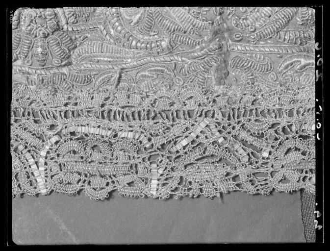 | Keywords: Tröja av sämskskinn. Förmodligen tillverkad av Jehan Beranger, Stockholm - Livrustkammaren - 2550.tif LSH artwork Friderich Feuerbrun pärlstickare Jehan Johan Beranger brodör sv Tröjan av sämskat skinn som tydligen parfymerats av s k innocenttyp med svängd midjelinje 10 skört ståndkrage och relativt korta ärmar med öppna sömmar framtill På grund av det ganska stela och styva materialet eller av att man begagnat sig av ett något urvuxet plagg har man försett det med diverse kilar och tillskarvade stycken Tydligen har man broderat de tillskurna bitarna innan de sedan fogats samman Broderiet är av något annan karaktär än kasackens och byxornas som däremot sinsemellan förefalla likartade I tröjan kan man spåra mer av stramhet Broderiet har sytts icke blott genom lädret utan också genom ett relativt grovt lärftsfoder 17x17 tr/cm2 som lagts mot lädrets insida Broderiet utgörs även här av en bård Den upptar egentligen ett strängt stiliserat mönster av 16 cm höjd och har nertill vid ytterkanterna begränsats av en repstav och härovanför av en bård som innehåller delar av vad man skulle vilja kalla lambrequinmotiv lagt med repstav Ovanför denna bård följer kompositioner med fruktkorgsmotiv samt palmettarrangering helt symmetriska Allra överst komma dock tulpanliknande blommor som böja sig varannan gång åt höger varannan gång åt vänster Rakt ovanför lambrequinmotivet sitter en liten symmetrisk 7-bladig palmett Anmärkningsvärt är att man tydligen på tröjan sedan de broderade läderstyckena monterats broderat små kantiljer utanför sömmen d v s i mönstrets fortsättning på det andra läderstycket På ärmarna har man t o m broderat ett ca 4 á 5 cm brett parti i något klumpigare utförande på det nedersta ärmstycket Här kan observeras att man genomgående glömt att göra stycket spegelvänt i förhållande till den intilliggande fruktkorgen Mönstret är för övrigt otroligt väl anpassat till bårdens bredd så att dess proportioner växla på det mest följsamma sätt Lädrets sömmar är hopkastade från baksidan med ca 6stygn/cm samt åt motsatt håll med ca 2 långa kaststygn sytt med 2-trådig högertvinnad grå lintråd I själva broderiet som sytts genom läder och linnefoder har man t ex tagit 9 stygn på en sträcka av 1 cm längd när man sytt ner paljettsträngen Man har använt olikfärgat silke grått gult brunt - med mellannyanser - samt rosa och halmgult Ett speciellt påpekande bör göras angående skörtens broderier Här har man nämligen förminskat mönstret till mindre rapport och endast broderat små blommor och ornament men likväl behållit lambrequinbården som även den förminskats Man kan lägga märke till delsatt när den 4 5 cm breda spetsen som sytts på skörtens 3 fria sidor denna sitter så långt in på broderiet att lambrequinbården helt döljs dels att man genomgående klippt fodertyget brokaden på baksidan något större än det broderade läderskörtet Dessutom har man på vänstra sidans främsta skört klippt av dess bakre sida vertikalt mitt i broderiet - man har tydligen från början broderat på ett alltför stort skörtstycke Blott en del skört har fått det yttersta snoddbandet som ingår i dekoren placerat på de 3 yttersidorna Kragen har broderier endast på höger sida ca 9 cm från framkanten räknat På vänster sida går däremot dessa ej ut från kanten utan ca 1 5 cm därifrån och omkring 8 cm åt sidan Det är en ståndkrage med ett 60-tal vertikala avsyningar över de 2 i det grova lärftsfodret 19x18 tr/cm2 horisontellt inlagda lång fiskbenen Dess söm bak ligger inte helt i mitten utan någon cm mer åt höger Upptill är den kantad med ett numera mycket trasigt grått ripsband och har haft vitt taftfoder på insidan Längs den raka framkanten knäpps tröjan med 22 st knappar ca 1 2 cm i diameter varav den 6 e uppifrån saknas Dessutom finns i ståndkragen 3 knappar av samma sort och lika många tränsar av guld- och silvertråd Ärmarna saknar nertill vid uppslagen knappar och knapphål och skiljer sig härigenom från flertalet tröjor På det högra framstycket där knapparna sitter finns en ca 4 5 cm bred knypplad guld- och silverspets med inlagda breda silverlan som nedifrån skörtets yttersta spets och uppåt räknat når till en höjd av 25 cm Härovanför vidtar en betydligt smalare spets blott 2 8cm bred Detta arrangemang verkar vara ursprungligt då man kan finna liknande tillvägagångssätt på andra tröjor På den knapphålsförsedda vänstra sidan saknas spets helt Placeringen av den breda spetsen tyder på att plagget blott skulle vara knäppt t o m det 12 e eller 13 e knapphålet uppifrån räknat Numera kan man göra den iakttagelsen att just dessa knapphål slitits vilket visserligen även skett med det 20 e som dock kantänkas härröra från tidigare utställning I övrigt har den breda spetsen tydligen suttit runt omkring alla skört Varje skört drar ca 40 cm vid de öppna ärmsömmarna i de öppna ärmuppslagens insidor runt ärmsömmarna på axelsömmarna och 38 cm på vänster framstycke och eventuellt även på kragen Numera finns spetsarna uteslutande kvar på 1 a skörtet på höger sida skörten mitt bak samt det 3 e på vänster sida i bägge ärmarnas långa sprund i ärmuppslaget på vänster ärm runt höger ärm samt vid nedre delen av vänster ärmringning på höger axel och den redan nämnda biten på höger framstycke I midjesömmen under skörten sitter på insidan 6 st byxtampar försedda med vardera 2 hål Den mellersta på höger sida är troligen senare ditsydd eftersom den är klädd med en glesare vävnad med mörkare guldlan De övriga är - som brukligt är - sydda av foderbrokaden Tröjan är fodrad med s k gyllenduk d v s guldbrokad Den har en vådbredd av minst 50 cm utan stad ca 70x20 tr/cm2 med varp av otvinnat vitt silke Inslaget bildas av tjockare vitt silke med silverlan på rätan i varje inslag sam
